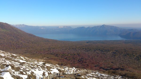 振り返れば支笏湖。せっかちな雪が地表には残っていました。